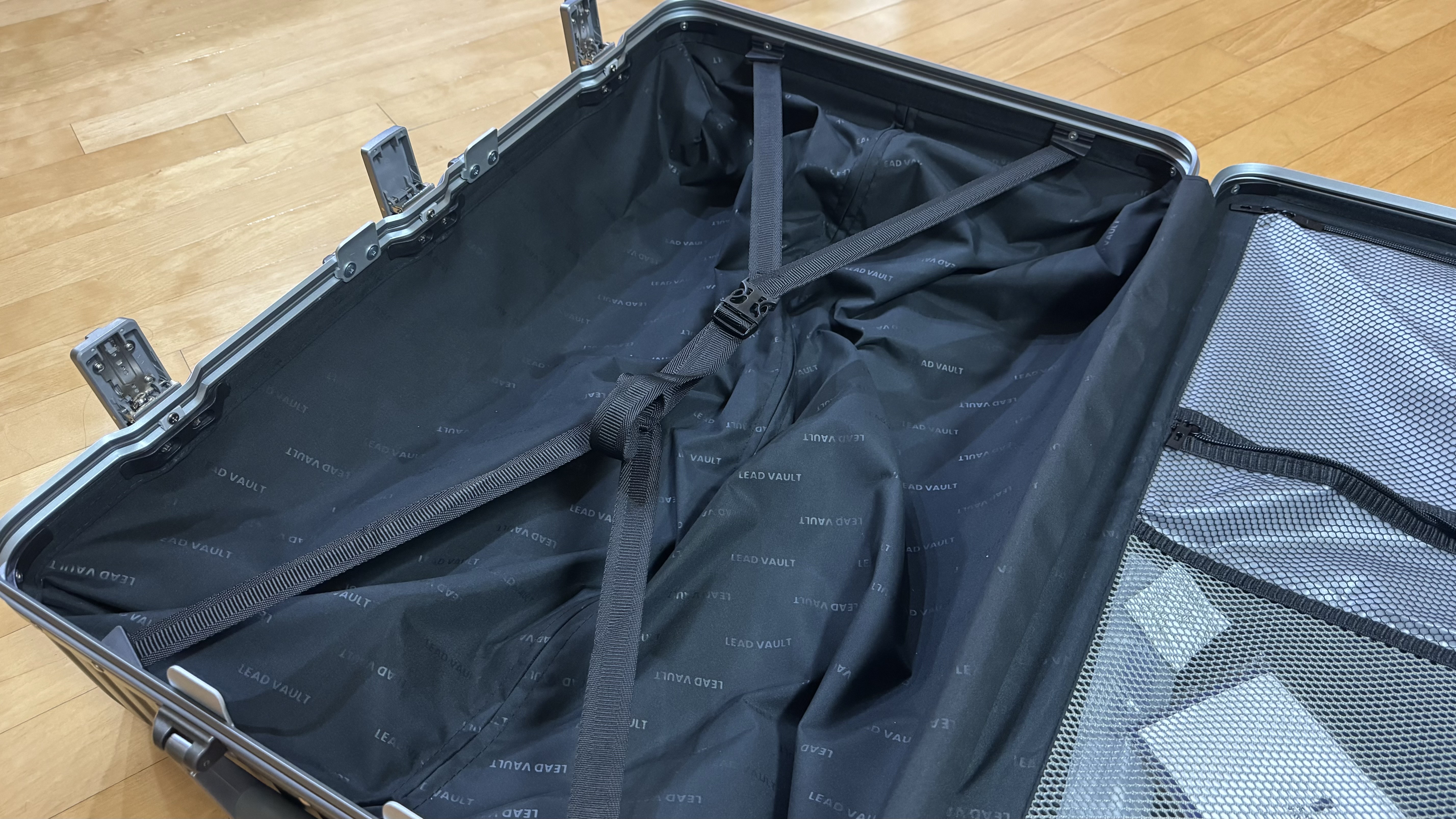 좌우로 나뉘어져 있는 한쪽에는 고정용 밴드가 있고, 수납 부피에 따라서 결착력을 조절할 수 있다.