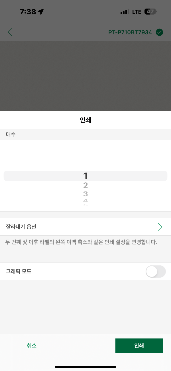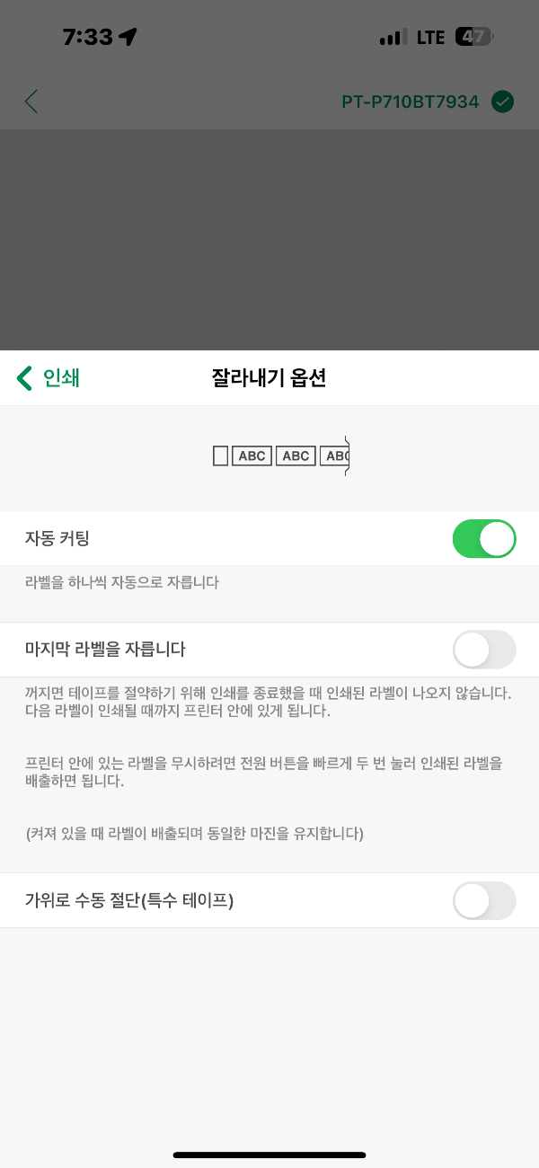 아래 화면처럼 해당 기능을 끄고 사용하면 마지막으로 인쇄한 것은 계속 라벨기에 남아있고, 바로 전단계 인쇄한 출력물만 커팅되어서 나오게 됩니다. 그럼 계속해서 초기 라벨을 인쇄할 때 생기는 마진을 없앨 수 있습니다. (캡처 화면에 나온 문구처럼 전원버튼을 빠르게 2번 누르면 안에 남아있는 출력 라벨도 커팅됩니다.)