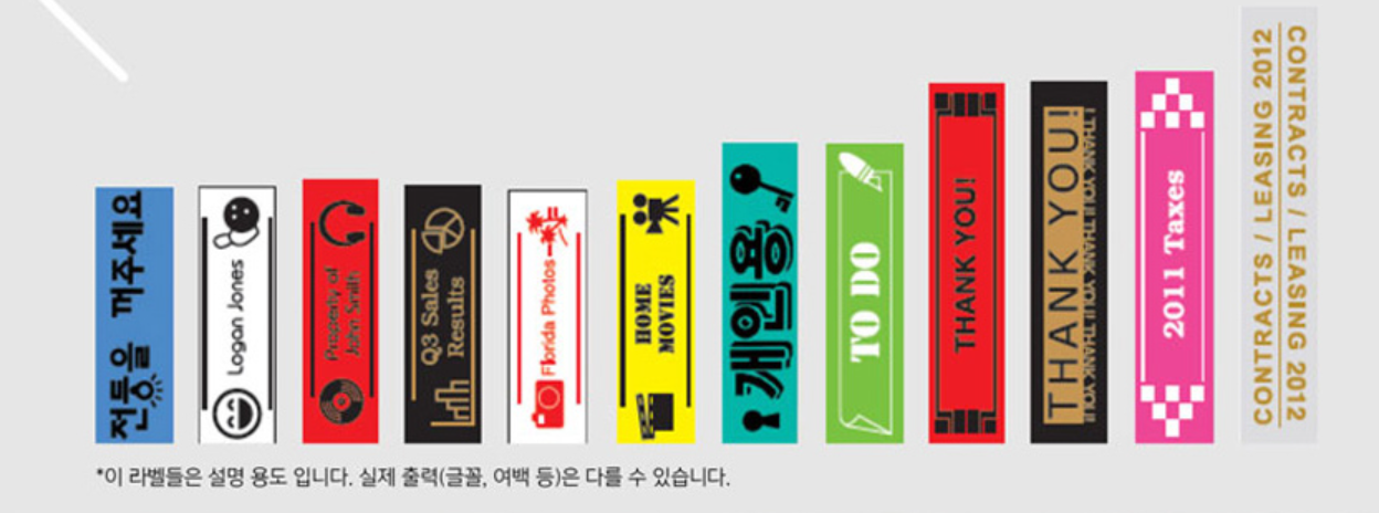 라벨테이프 용지 사이즈를 여러 가지 조건이나 용도에 맞춰서 선택할 수 있다는 것도 장점입니다. 3.5MM~24MM까지 다양한 폭을 지원하고, 글자색과 배경색에 따라 수십 가지의 조합이 제공되는 라벨테이프를 모두 사용할 수 있습니다.