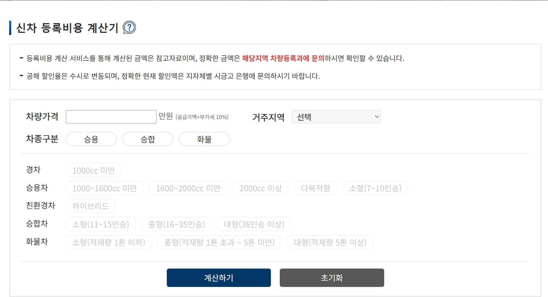 3. 아래의 화면에 차량가격, 거주지역, 차종구분, 구매하려는 자동차의 배기량을 확인 후 계산하기 클릭!