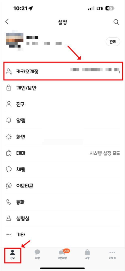 아래 이미지처럼 카카오톡을 실행하신 이후에 아래쪽의 친구를 누르시면 맨 위에 현재 나의 정보가 표시됩니다. 그리고 위쪽에 톱니바퀴 모양의 설정을 누릅니다.