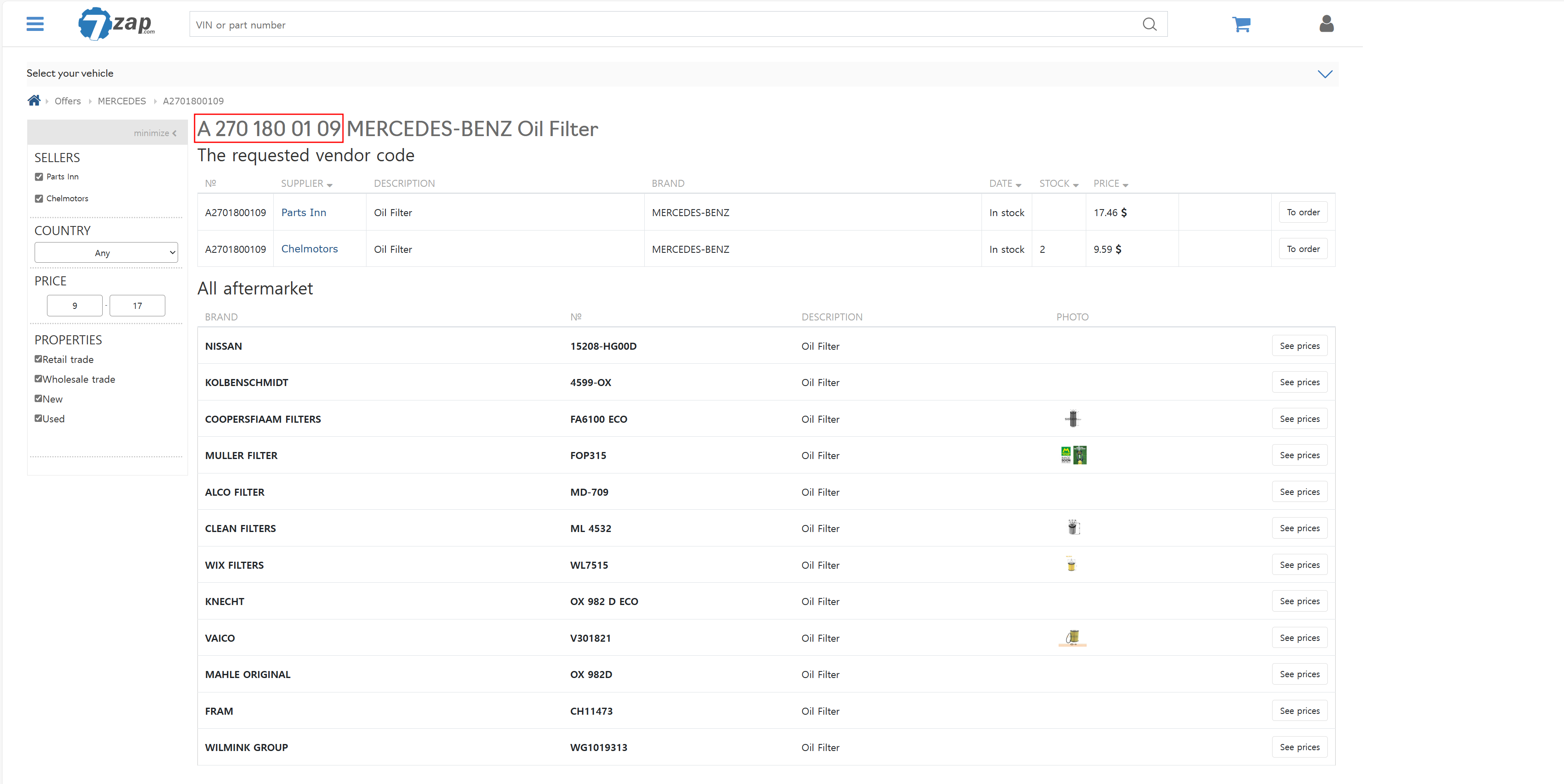 여기서 A 270 180 01 09 가 오일필터 부품 번호입니다.